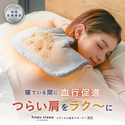 寝ている間に肩のコリをケアする、管理医療機器認証の磁気サポーターです。最大磁束密度160mTの強力な永久磁石を計4つ配置し、広範囲の血行を促進。さらに遠赤外線放射繊維「シャイネックス」を採用し、冷えやすい肩口をじんわり温めます。着脱が簡単なワンタッチ面ファスナーで、就寝中も快適な使い心地です。
