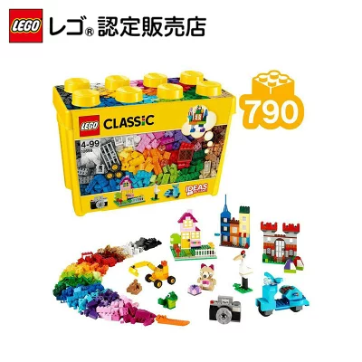33色のレゴブロックに加え、窓、ドア、タイヤといった特殊パーツが全790ピース入った豪華セットです。想像力を自由に働かせて、家や乗り物、動物など何でも作ることができます。組み立てのヒントになるアイデア説明書付き。便利なプラスチック製収納ボックスが付属しており、お片付けまで楽しく学べる知育玩具です。