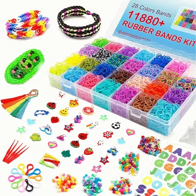 全28色のカラフルなゴムが約11,000本入った、ボリューム満点のルームバンドキットです。チャームやビーズ、編み針など必要なパーツが全て揃っており、届いたその日からブレスレットやネックレス作りを楽しめます。安全な素材を採用し、お子様の想像力や集中力を養う知育玩具としても最適。ギフトにも人気です。