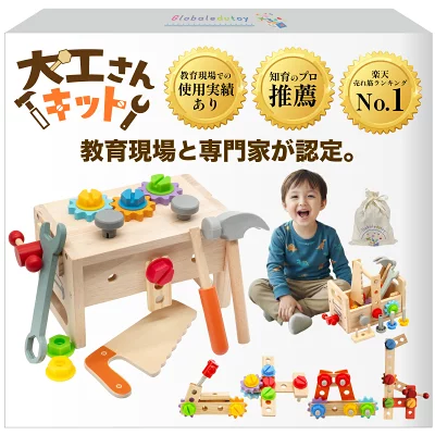知育のプロが推薦する、手指の発達を促す木製工具セットです。叩く・回す・締めるなど、大工さんごっこを通じて集中力や創造性を養います。食品衛生法試験合格済みで、お子様が舐めても安心な素材を使用。便利な収納ボックス付きで片付けの習慣も身につきます。レビュー投稿で工事用ベストの特典もあります。
