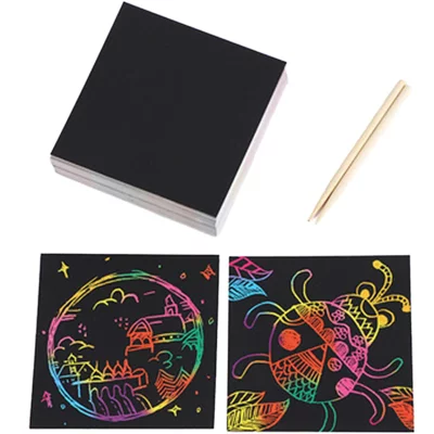 黒い表面をペンで削ると、中から鮮やかな虹色のカラーが現れるスクラッチアートの100枚大容量セットです。特別な道具は不要で、付属のペン一本ですぐに楽しめます。自由に描ける無地タイプなので、子供の想像力を養う知育玩具としてはもちろん、大人向けのメッセージカードや工作、イベントの景品にも最適です。