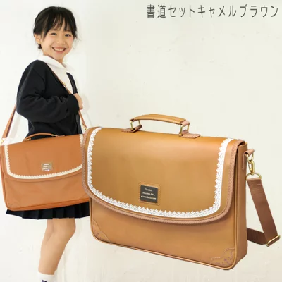 落ち着いたキャメルブラウンの合皮生地に、ゴールドの金具やロゴが映える上品で大人っぽいデザインの書道セットです。高学年になっても飽きずに使える洗練された外観が魅力。中身は使いやすさを追求し、コシが強く書きやすい「日本製特製太筆」を採用。フルオープン仕様のバッグで、道具の出し入れもスムーズです。