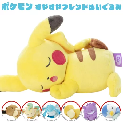 幸せそうな**「すやすやポーズ」と「ころん」とした丸いフォルム**が特徴のポケモンぬいぐるみです。ピカチュウやゲンガー、イーブイ進化形など人気キャラクターをラインナップ。やわらかい触り心地で、お部屋の癒しアイテムにぴったりです。贈り物にも喜ばれます。