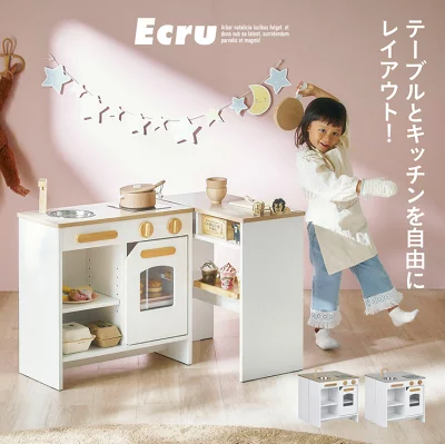 北欧風のナチュラルなデザインが魅力の木製ままごとキッチン「Ecru(エクリュ)」。キッチン本体と独立したテーブルを自由にレイアウトでき、L字型やアイランド型など、遊び方や空間に合わせた配置が可能です。リアルなコンロやシンクでお子様の想像力を育み、遊び終わった後は収納家具としても活躍します。