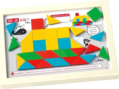 マグネット式の正方形と三角形のピースを使い、ボード上でパズルやモザイク作りを楽しむ知育玩具です。40例のガイドボードや多彩な作例を通じ、遊びながら図形の合成・分解・回転の感覚を養えます。さらに、ミニゲームで面積の基礎となる「広さの比較」も学べるなど、算数の土台作りを多角的にサポートする一冊です。