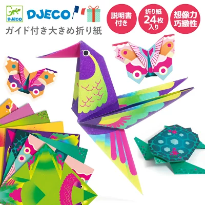 フランスの知育玩具ブランド「DJECO」の折り紙セットです。南国の鳥や蝶、カメなどをモチーフにした鮮やかでハイセンスなデザインペーパーが特徴。あらかじめ折る位置にラインや模様が施されているため、初心者や小さなお子様でも迷わず完成度の高い作品を作れます。飾っても楽しめるおしゃれな工作キットです。
