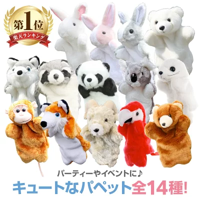 ふわふわで触り心地の良い動物たちのハンドパペットです。ウサギやクマ、パンダなど種類豊富。保育園・幼稚園での読み聞かせや人形劇、ご家庭での知育玩具として最適です。お誕生日や出産祝いのギフトとしてはもちろん、ペットのワンちゃん・ネコちゃんとのふれあい、店舗の装飾など幅広く活用いただけます。