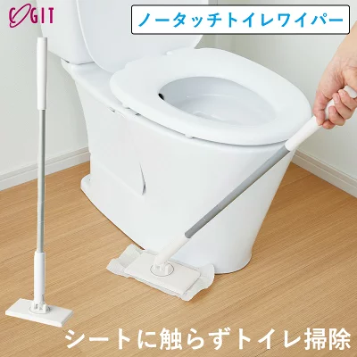 最大の利点は、汚れたシートに一切触れずに着脱・廃棄ができる「完全非接触」設計です。小回りの利くコンパクトヘッドが、一般的なフロアワイパーでは届かない便器の曲線や狭い隙間を徹底清掃。柄が短めで壁掃除もしやすく、腰への負担を軽減します。自立するため収納ケース不要で、使いたい時にサッと取り出せます。