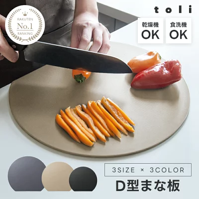 調理台を有効活用できるD型・かまぼこ型の抗菌まな板。耐熱エラストマー素材で、包丁の刃を傷めにくく、軽い衝撃吸収で作業音を軽減。食洗機対応(最大130℃)、熱湯消毒OKで、両面に滑り止め付き。おしゃれなカラー展開。