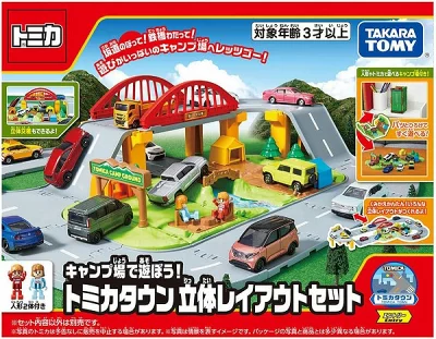 パッと開いてすぐに遊べるトミカタウンのセットで、今回はキャンプ場がテーマ。立体・平面で組み替え簡単な「鉄橋」「ジョイントどうろ」付き。様々な立体交差のレイアウトがつくれ、遊び終わったらコンパクトに折りたたんで収納できます。