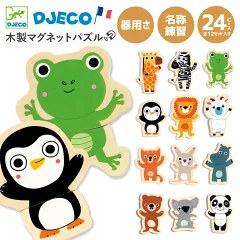 DJECO(ジェコ)の木製マグネットパズル。12種類のジャングルの動物をモチーフにした磁石のおもちゃで、動物の上下を組み替えて遊ぶ絵合わせ知育玩具です。創造力と想像力を育み、1歳、2歳のお子様におすすめです。