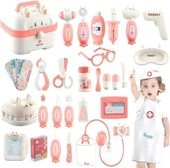 ウサギがモチーフのかわいいミニドクターお医者さんごっこセットです。歯医者ごっこも楽しめるアイテム付きで、本格的なお医者さん遊びができます。医者服も付属し、知育や社会性、言語力、想像力の育成に役立ちます。男の子、女の子問わず、クリスマスプレゼントにも最適なおもちゃです。