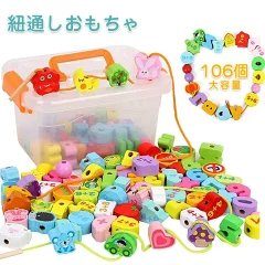 106個の大容量セット! ひも通し、絵柄・数字・英語認知の4つの遊びで、2~6歳のお子様の指先訓練、集中力、発想力を楽しく育みます。 野菜・果物・動物などのカラフルなビーズと数字・アルファベットピース入り。安全な木製で角も丸く安心です。プレゼントにも最適。