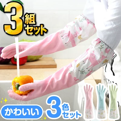 最大の利点は、肘まで隠れるロング仕様で袖口が濡れる心配がない点です。薄手で指先の感覚が掴みやすく、細かい作業もスムーズ。手のひらには滑り止め加工があり、洗剤を使った食器洗いも安心です。また、3枚セットなので「キッチン用」「お風呂用」と場所ごとに色分けして使い分けられるため、衛生的に管理できます。